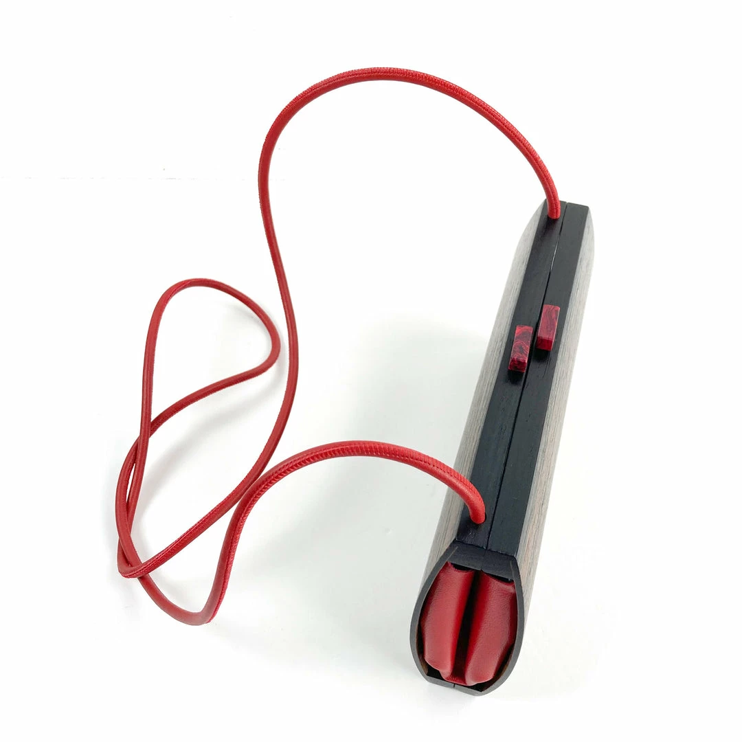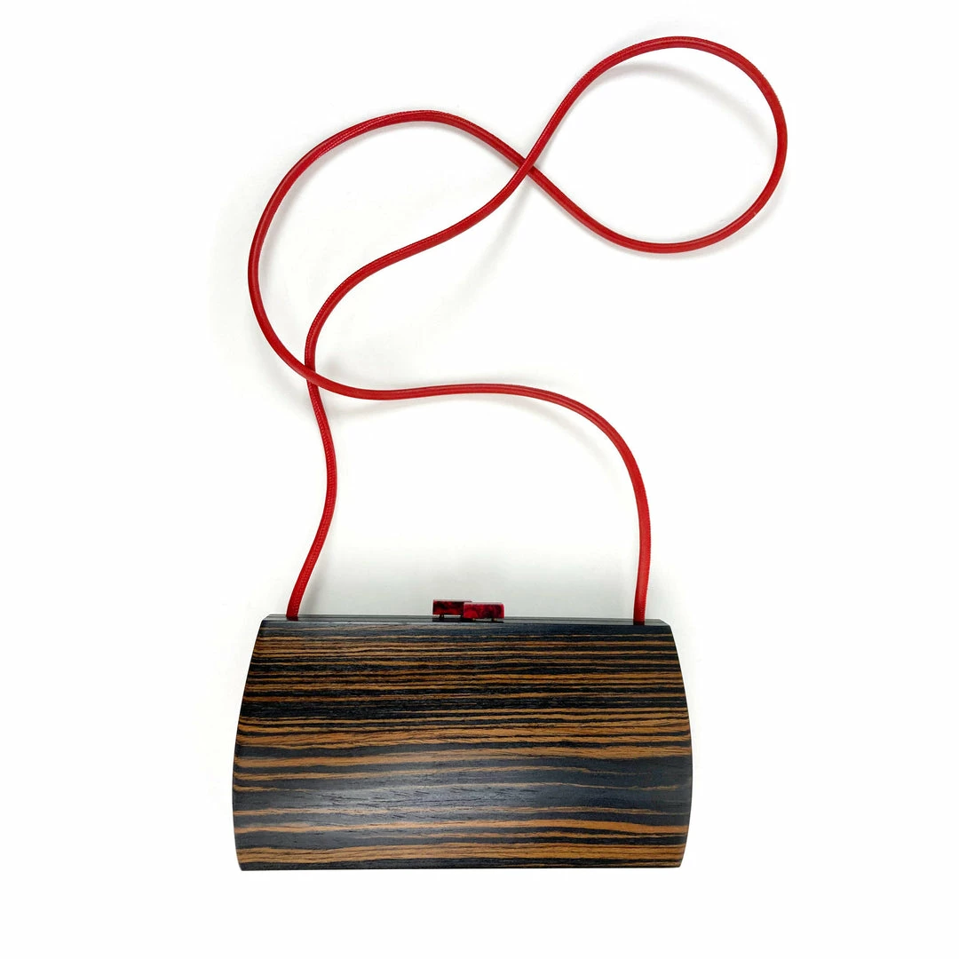 Macassar Ebony body; Black Obechi edge; Hybrid Acrylic clasp; Leather gussets and strap (48″) available in red or black leather. Signed by the artists. Dimensions: 8.5″ W x 4.5″ H x 1.5″ D