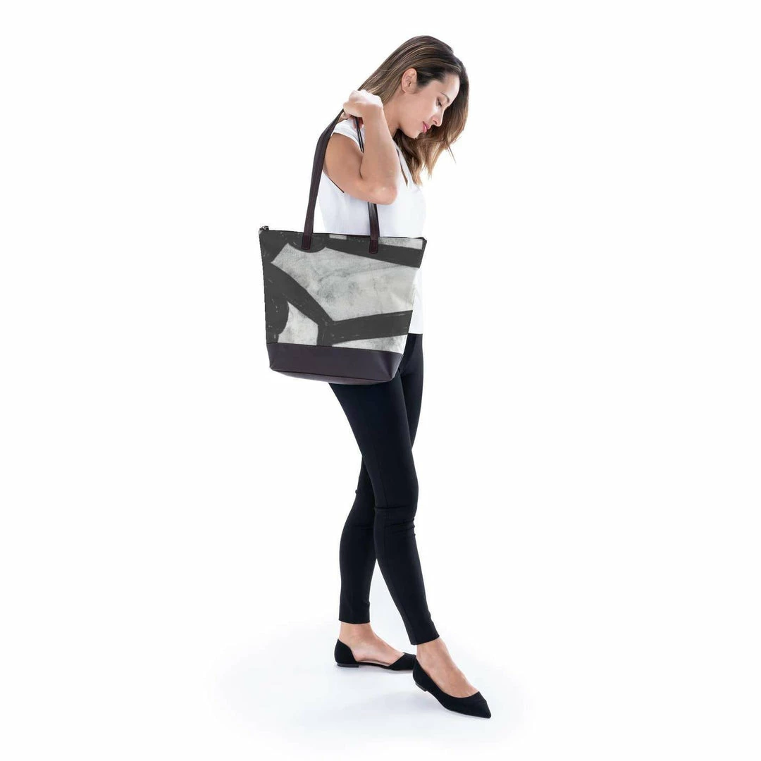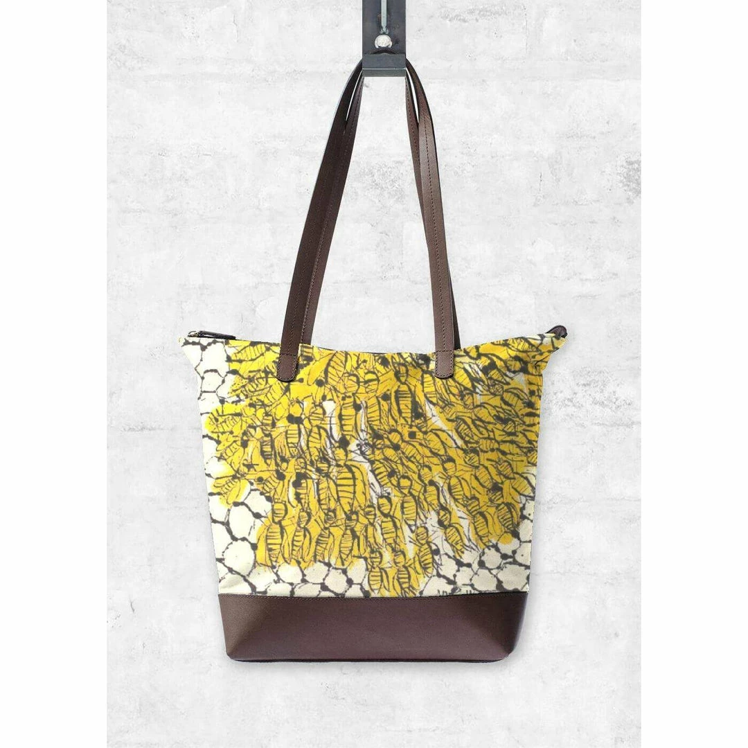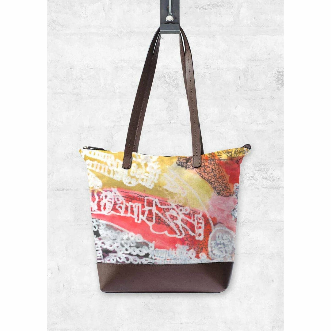 Statement bag. 100% cotton with 100% cow leather accent. One size: 16.5″ w × 14″ h. The Vida statement bag, featuring designs by different artists, complete with genuine cow-hide leather straps, leather base, and trims. Accessorize with this bag for a statement look that turns heads and sparks conversations – around town or across the world.